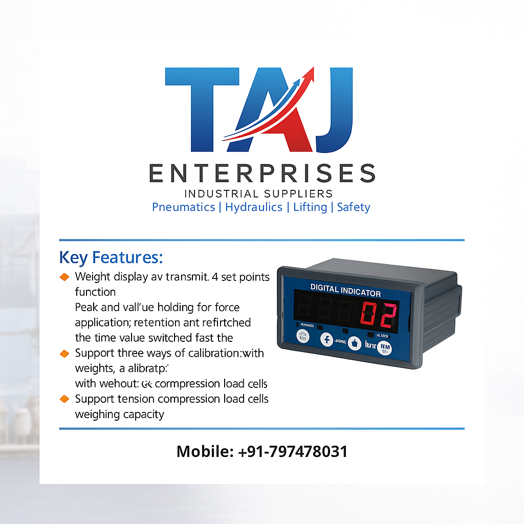 Enhance your industrial operations with our advanced Digital Indicator — designed for precise weight and force measurement. It offers 4 set points, peak hold, fast response, and supports multiple calibration methods. Perfect for tension and compression load cell applications in industrial weighing systems. #TAJEnterprises #DigitalIndicator #IndustrialSupplies #LoadCell #WeighingSystem #Pneumatics #Hydraulics #LiftingEquipment #IndustrialAutomation #EngineeringSolutions #PrecisionMeasurement #IndustrialSafety Email - tajenterprises51@gmail.com Contact - +91-7974785031