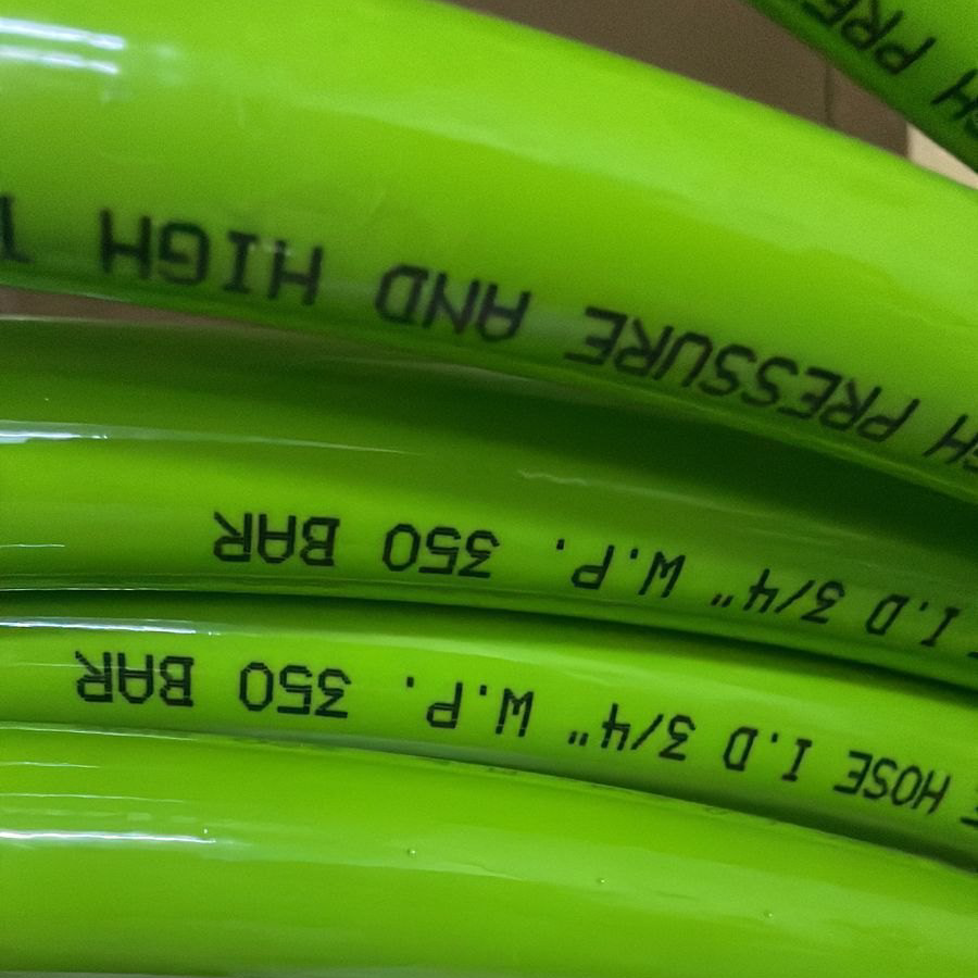 #TAJENTERPRISES #HIGHPRESSUREHOSE #350BAR #PAINTHOSE Very High Pressure hydraulic lines 300 to 700 bar compact, high pressure, light weight, high abrasion resistance and low change in length for use with petroleum, synthetic or water based fliud in hydraulic systems. Mainly used for rescue, safety equipments. Thermoplastic Elastomer PH350 - Double braids of steel wire. PH351 - One or more braids of aramid fiber with one braid of steel wire.