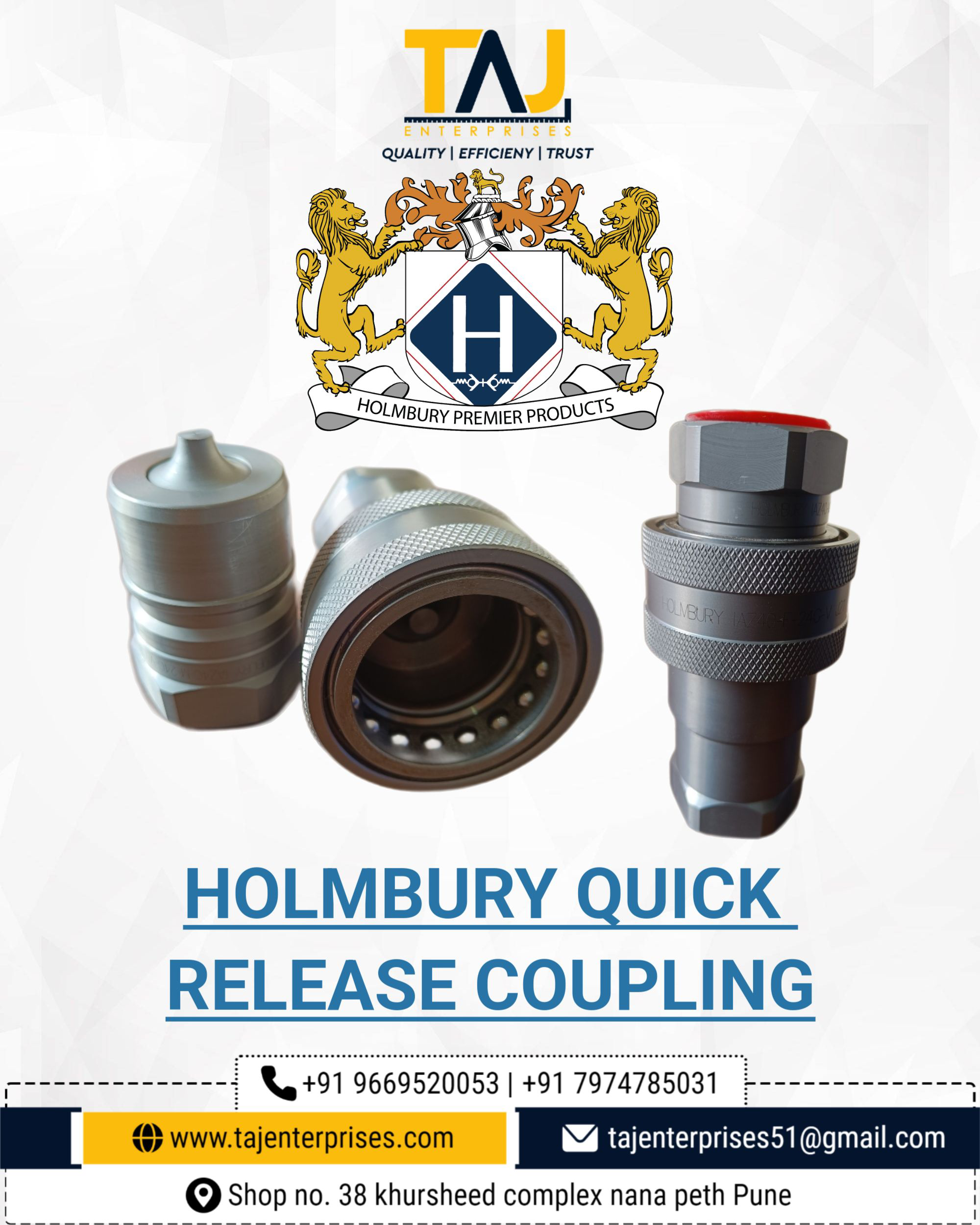 #TAJENTERPRISES #HOLMBURY #QRC #IAZ #HQSERIES #INDIA #SUPPLIERS #JOINUS Quick release couplings are fitting are used to mate fluid lines with system equipment that requires frequent connecting and disconnecting. They are used in both pneumatic and hydraulic applications to build or discontinue the connection of a fluid pipeline.